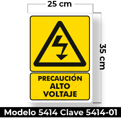 Señal de «PRECAUCION ALTO VOLTAJE» eleborada en estireno calibre 40 medida de 25 x 35 cm.