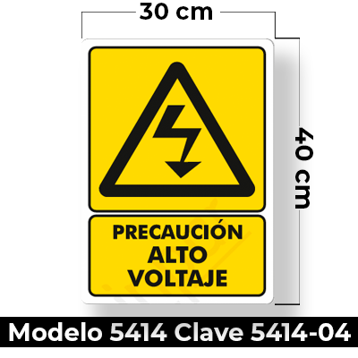 Señal de «PRECAUCION ALTO VOLTAJE» eleborada en estireno calibre 40 medida de 30 x 40 cm.