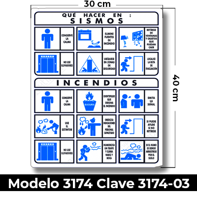 Señal de «QUE HACER EN CASO DE SISMOS» eleborada en estireno calibre 40 medida de 30 x 40 cm.
