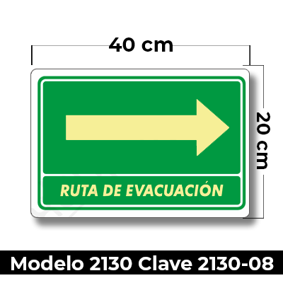 Señal de «RUTA DE EVACUACION DERECHA» eleborada en estireno calibre 40 con fotoluminicente medida de 20 x 40 cm.