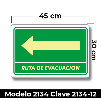 Señal de «RUTA DE EVACUACION IZQUIERDA» eleborada en estireno calibre 40 con fotoluminicente medida de 30 x 45 cm.
