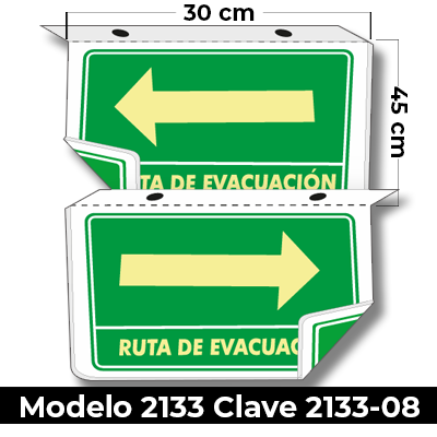 Señal de «RUTA DE EVACUACION TIPO PLAFON» eleborada en estireno calibre 40 con fotoluminicente medida de 30 x 45 cm.