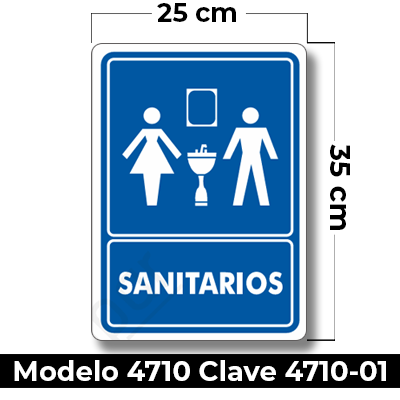 Señal de «SANITARIOS» eleborada en estireno calibre 40 medida de 20 x 35 cm.